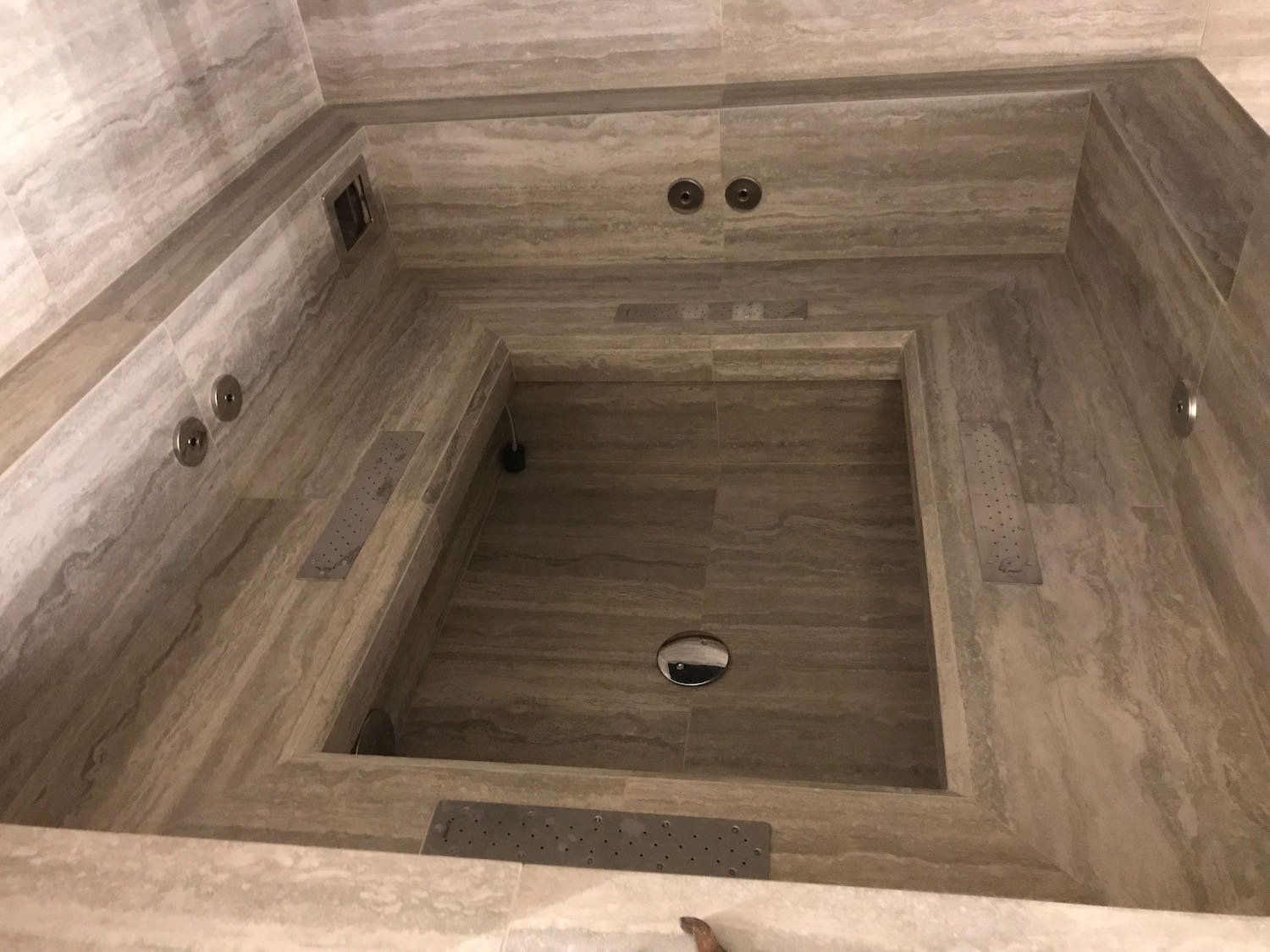Félicitations à notre équipe de carreleurs qui ont également éffectué la pose du carrelage dans tout l’espace wellness. On admire leur travail d’une grande précision, avec de nombreuses coupes à 45° et un débordement parfait sur toute la longueur du bassin.