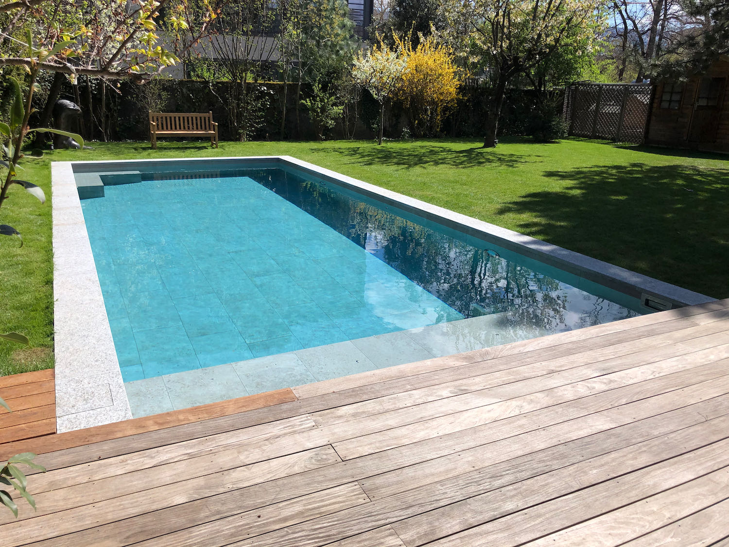 Construction d’une piscine avec carrelage et plage immergée, habillage terrasse en bois IPÉ.
