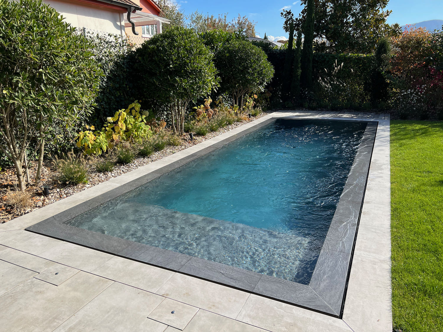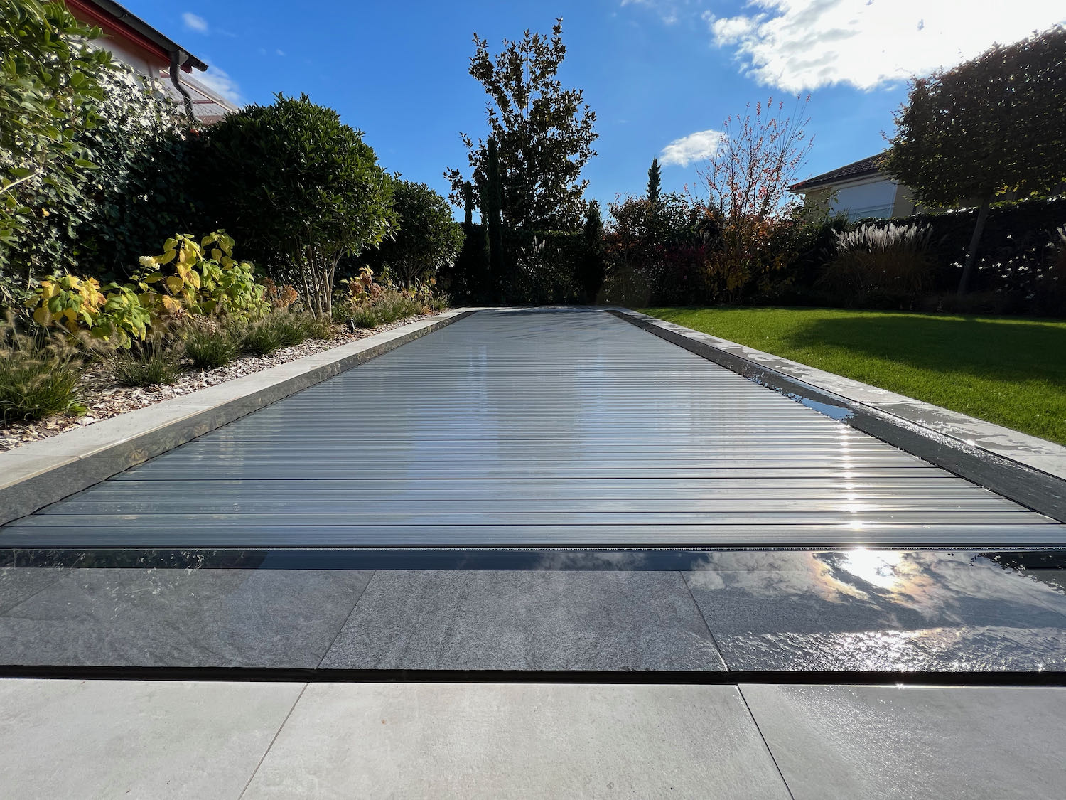 Rénovation d’une piscine avec débordement sur un côté, en carrelage gris Anthracite, avec un volet sous plage immergée et pièce BWS® en inox.