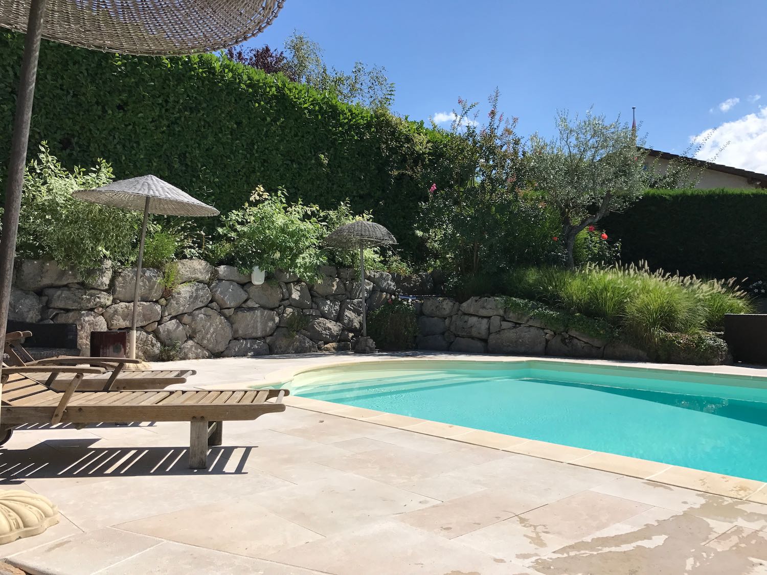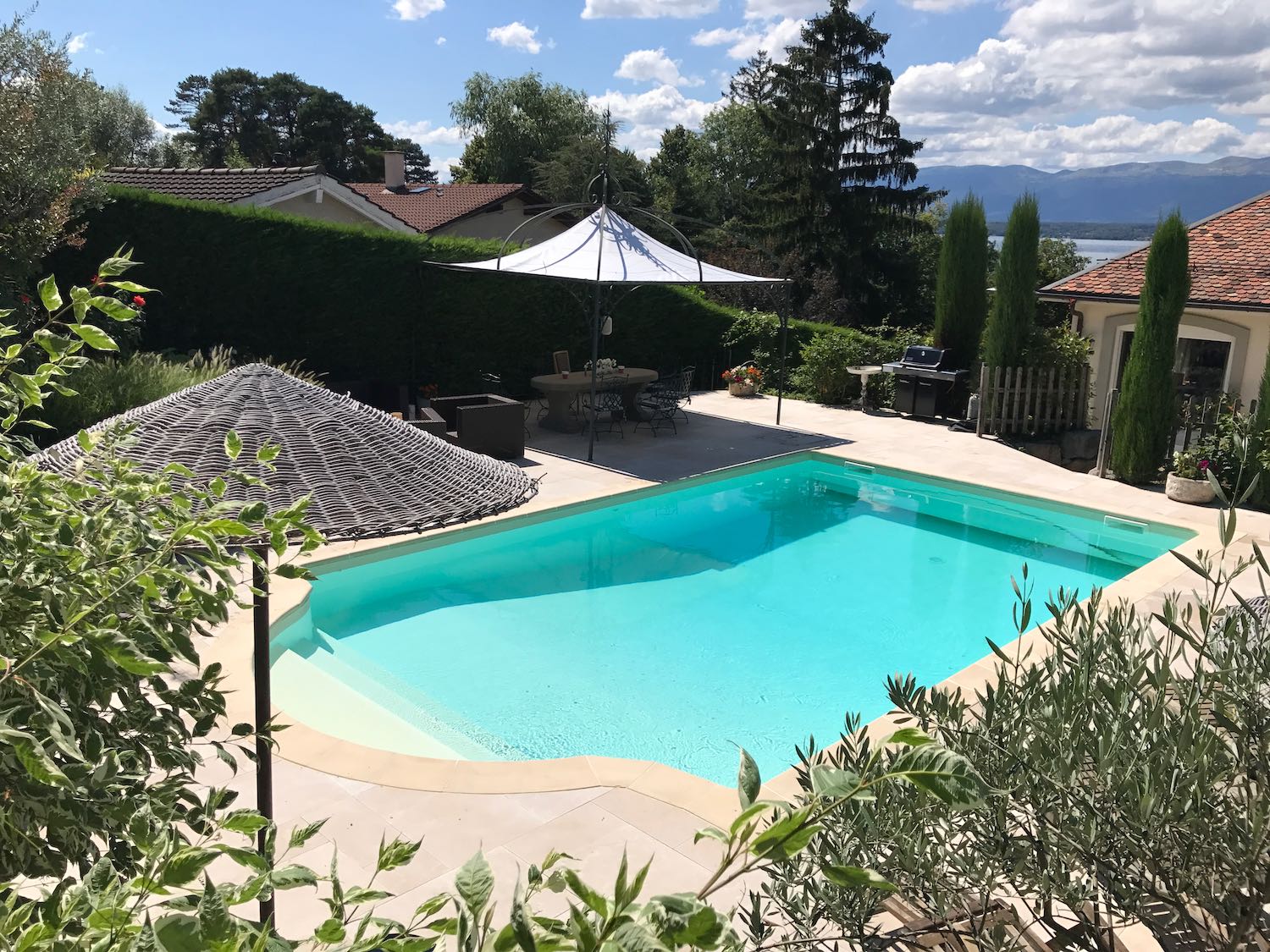 Magnifique réalisation, construction en carrelage et pierre naturelle avec Pool House, aux portes de Genève.